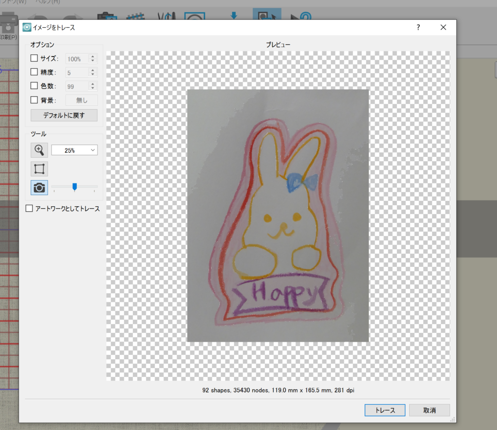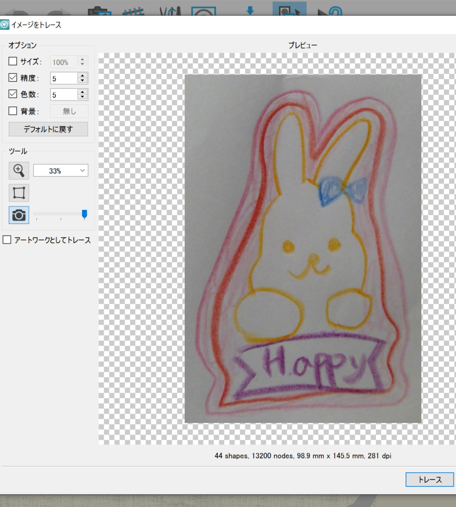 デフォルトでは「サイズ100%、精度5、色数99、背景無し」となっている