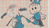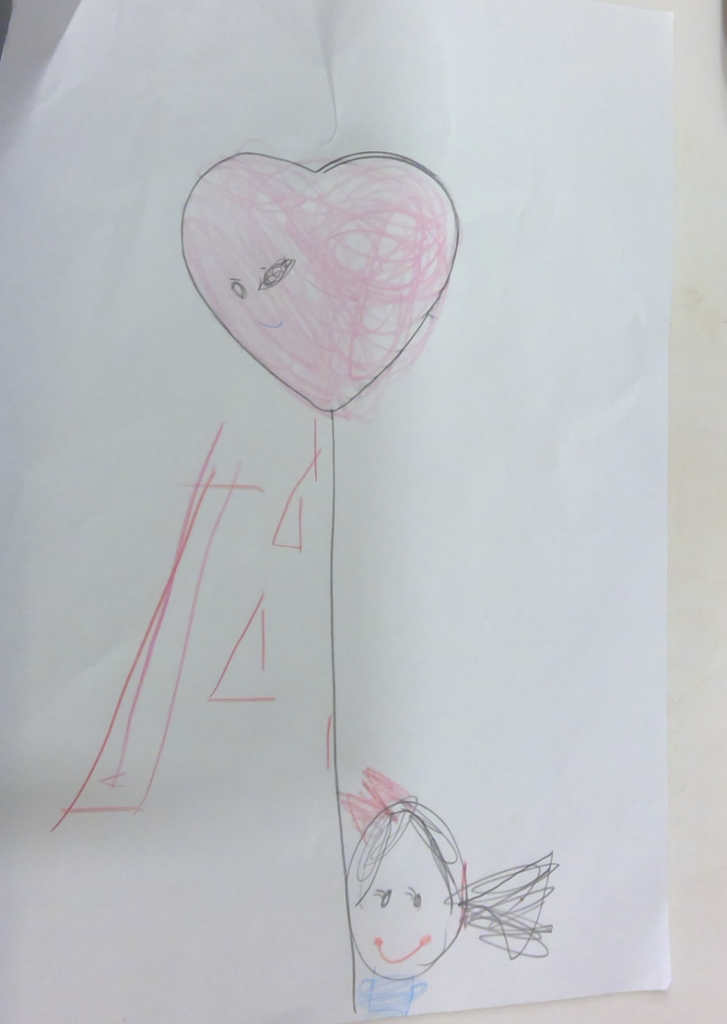 白地の紙に「黒」「赤」「青」「ピンク」の4色の色鉛筆で描いた絵