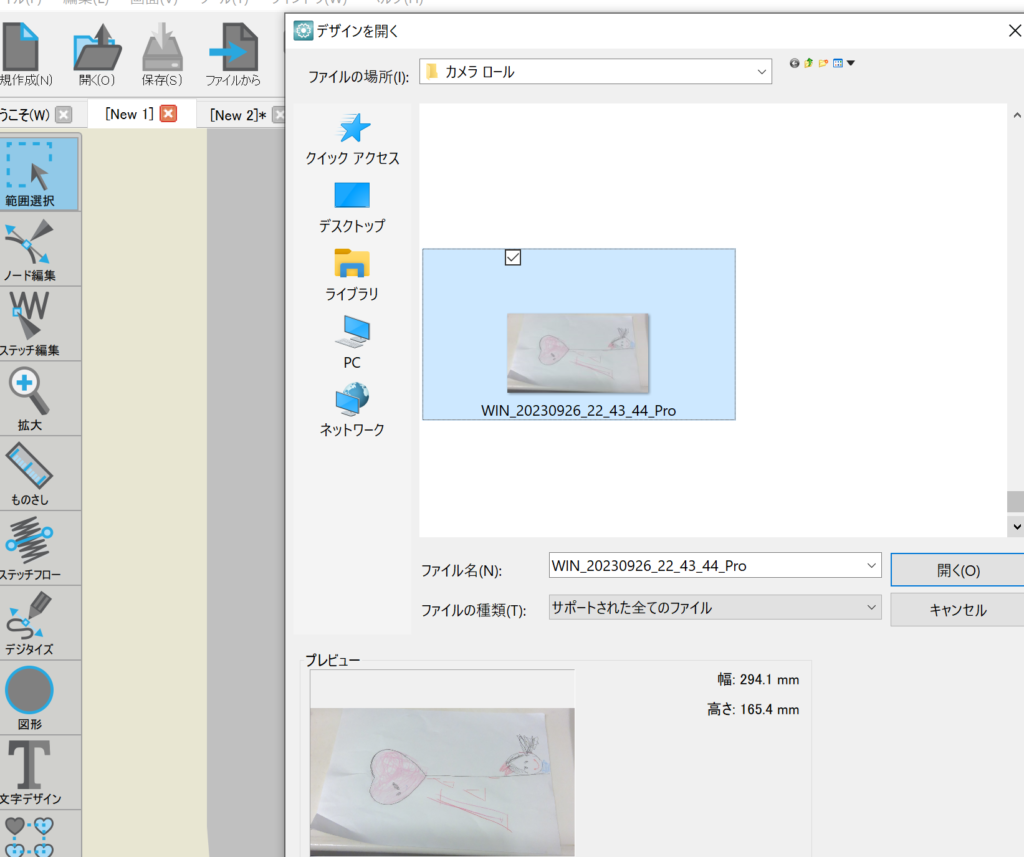 PCに搭載されているカメラで撮影したイラストの写真を使用するため、ファイルの場所「カメラロール」