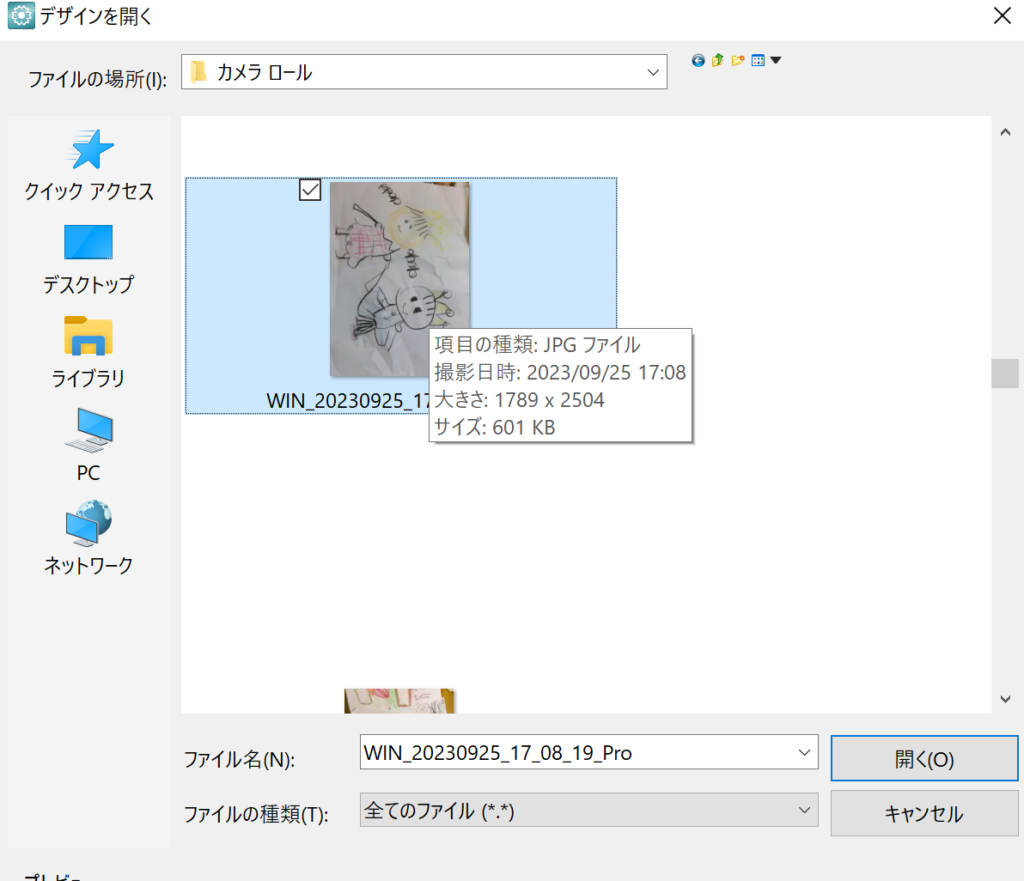 ファイルの種類は「全てのファイル」