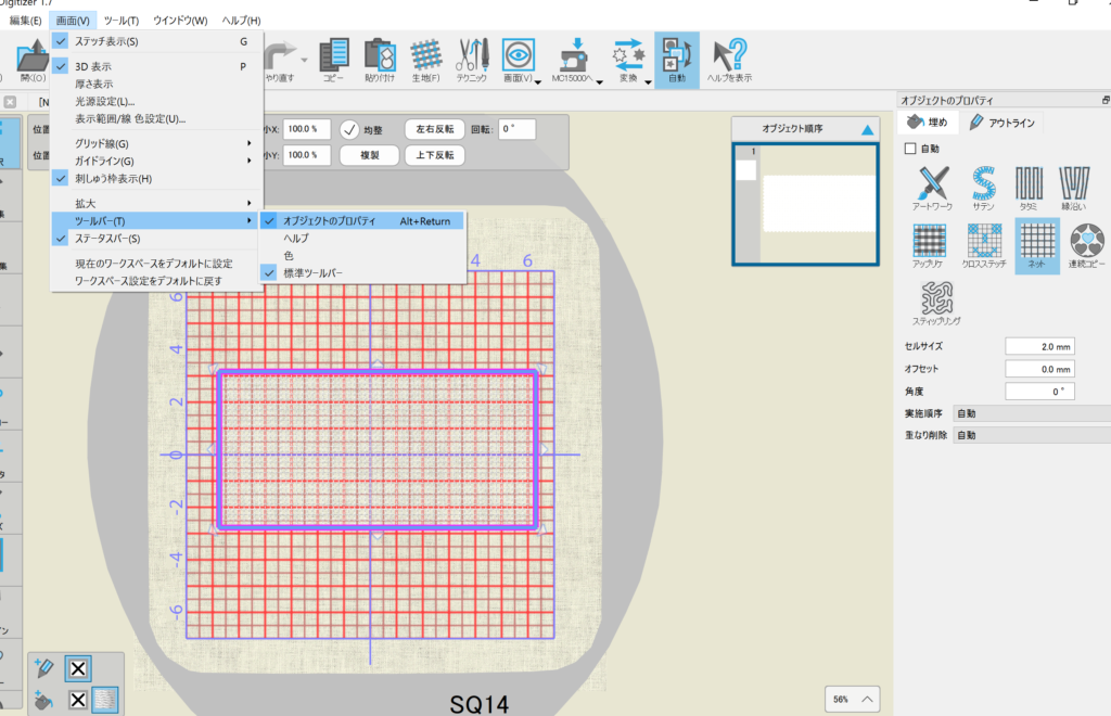 「図面」→「ツールバー」→「オブジェクトのプロパティ」→☑標準ツールバー→「アウトライン」の「ネット」を選択