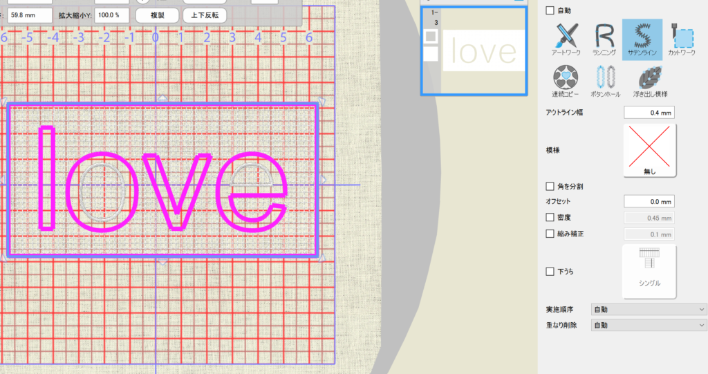 現在の文字デザインは「アートワーク」状態。ステッチを決定する(サテンラインを選択)