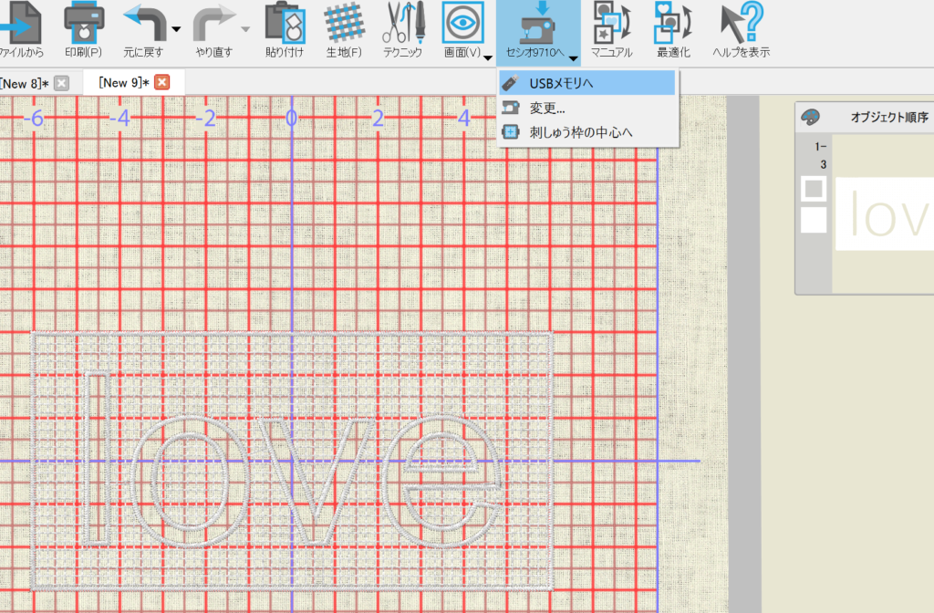データを送りたいミシンの型番を選択→「USBメモリへ」